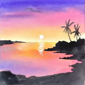Hoàng hôn tím cùng với hoàng hôn vàng đều là một bài bắt đầu cho những ai mới làm quen với màu nước. Thử sức với nó và cũng là tập làm quen với kỹ thuật cơ bản nhất của màu nước: Ướt trên ướt.