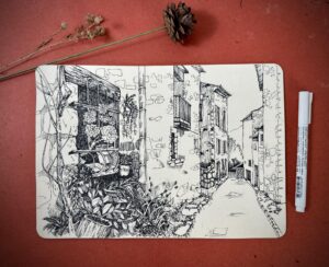 Một góc phố cổ kính và lặng lẽ của nước Pháp: Tourrettes-sur-Loup. Vừa là một đề tài về ký họa, vừa là nơi ta gặp luật xa gần được biểu diễn như thế nào trong một bức tranh. Thử sức với nó xem sẽ ra sao nhé.